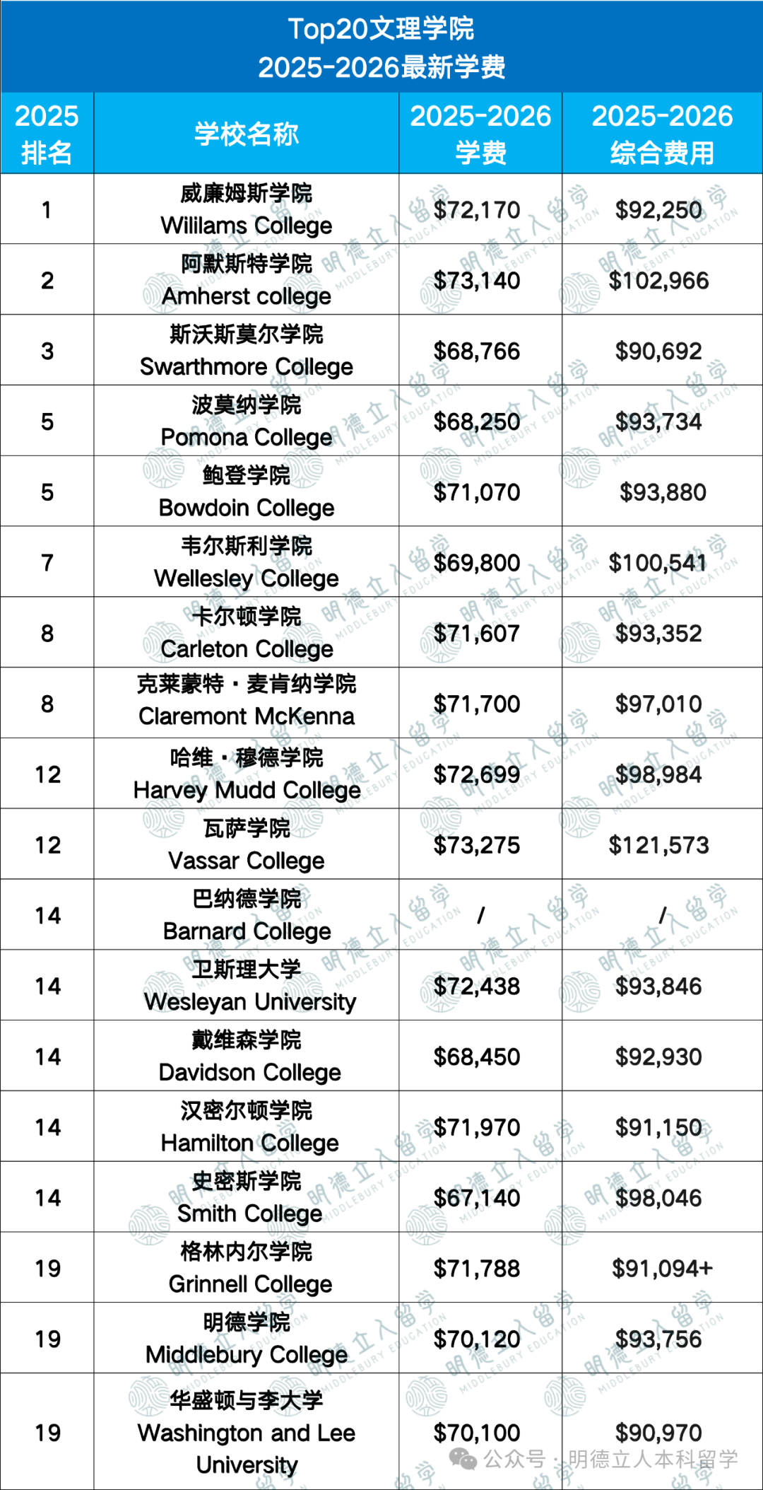 在2025-2026的最新学年学费信息,除了斯沃斯莫尔学院、波莫纳学院、韦尔斯利学院、戴维森学院、史密斯学院学费低于7万美元,巴纳德学院暂未公布数据外,其余前20名的文理学院学费均超过7万美元。