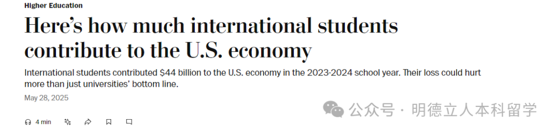 《华盛顿邮报》在前几天,发表了一篇关于国际学生对美国经济贡献的文章,提到在2023 - 2024 学年,国际学生为美国经济贡献440亿美元。