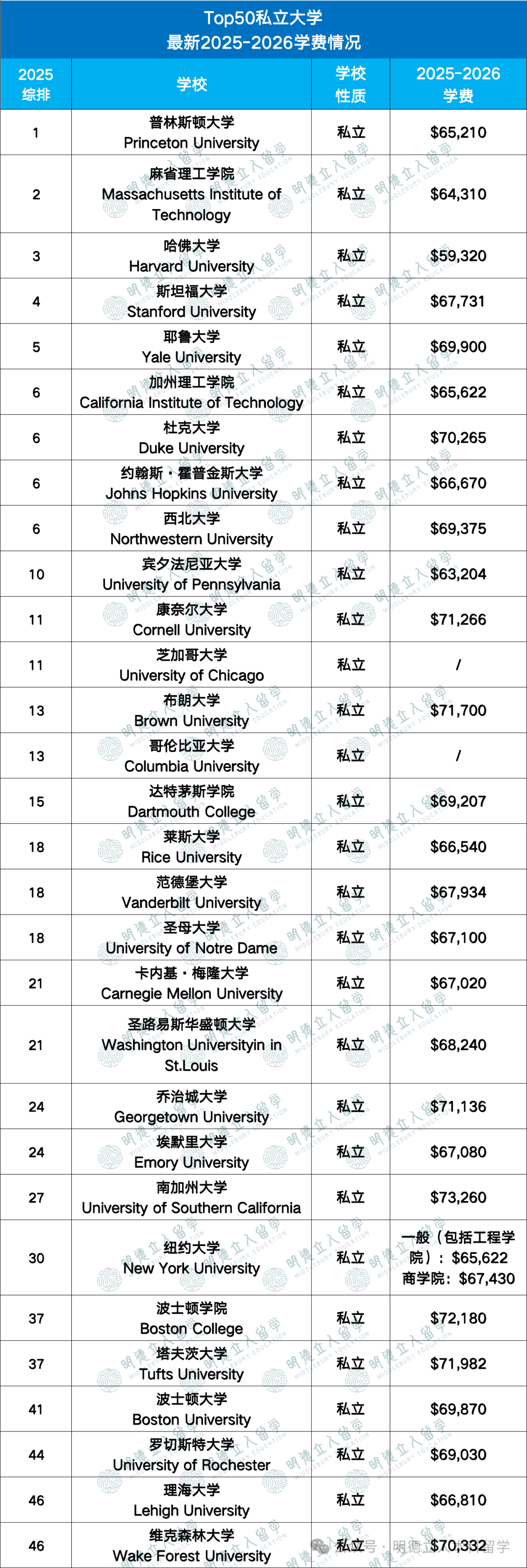 Top50的30所私立校,除了哥大、芝大未公布数据,2025-2026学年的平均学费在6万8美元。