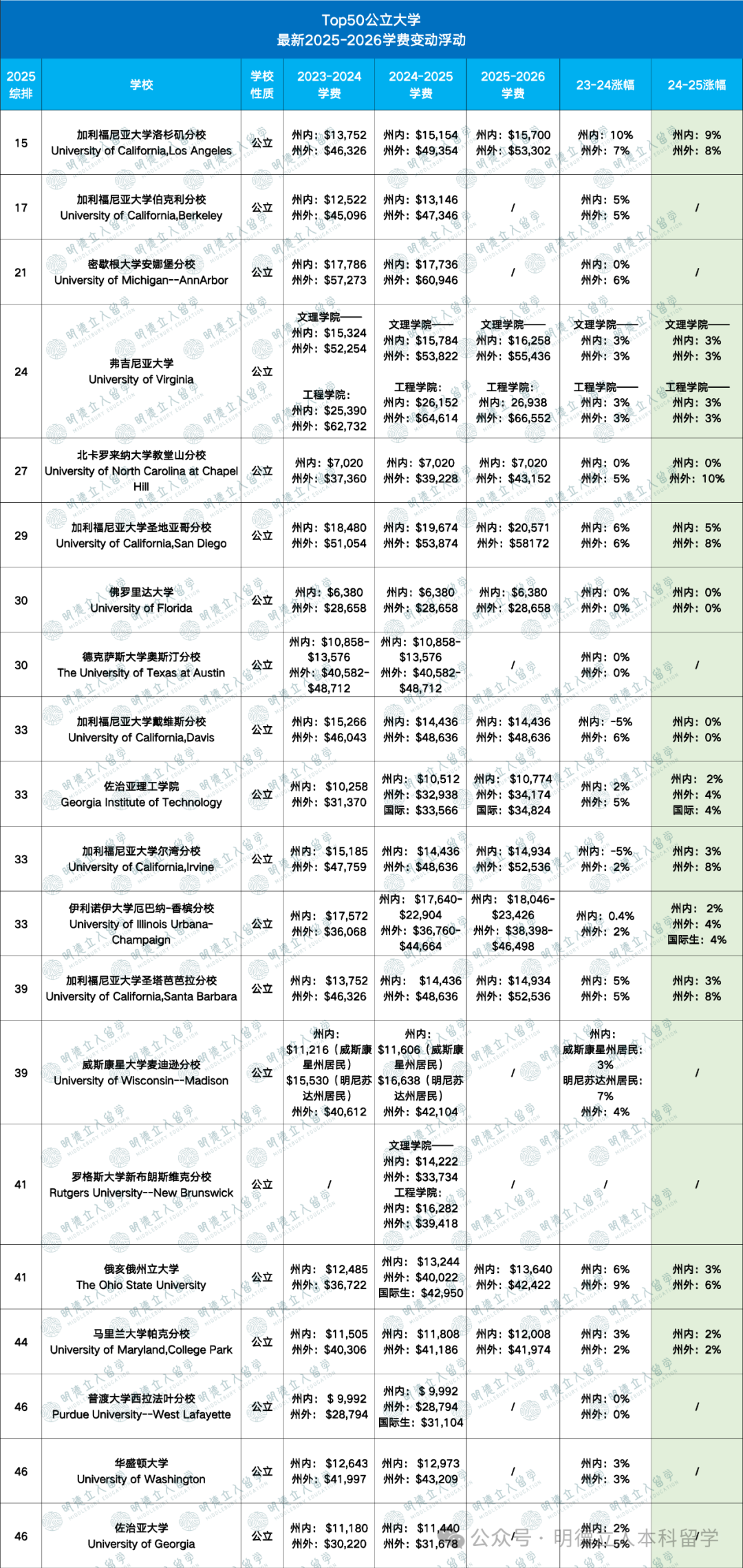 而北卡、UCD、UIUC、俄亥俄州立、马里兰帕克的州外学费在4万-5万美元之间,除了UF、佐治亚理工州外学费也低于4万美元。