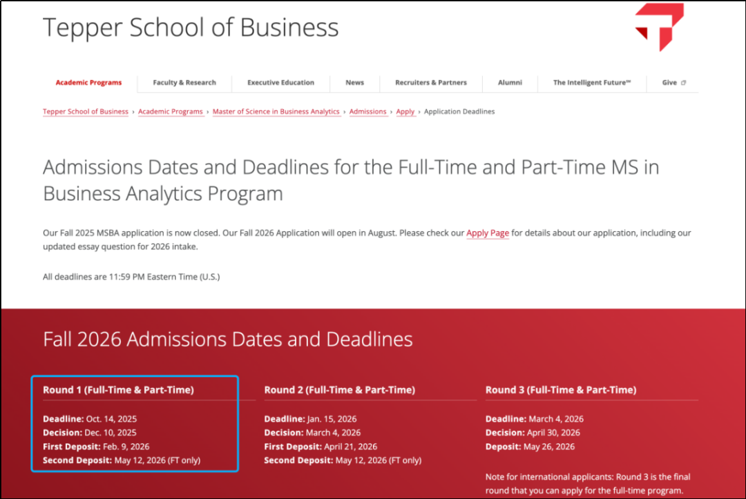 CMU Tepper商学院的商业分析硕士第一轮申请在10月14日截止。