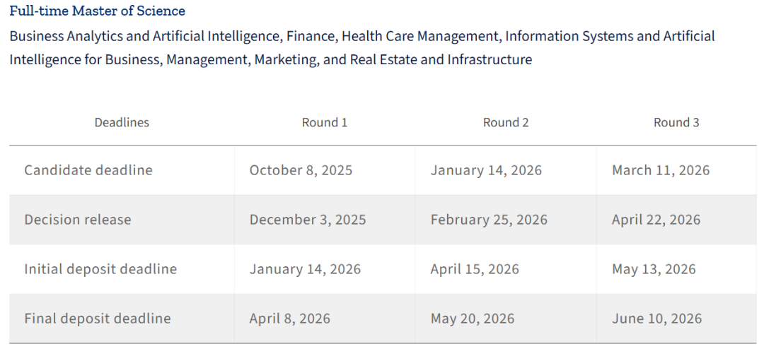 全日制理学硕士,包含商业分析与人工智能、金融、医疗保健管理、信息系统与商业人工智能、管理、市场营销以及房地产与基础设施,第一轮截止日期到10月8日!