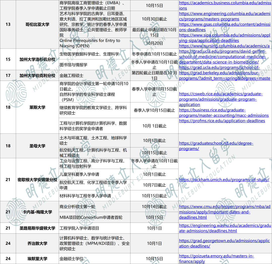 美硕申请通常从每年8月、9月开始,申请多在12月至次年1月截止,部分专业3-5月仍可申请,最早的也有10月左右截止的!