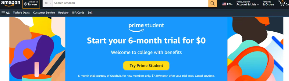 Amazon,用edu邮箱注册就可以拥有的免费Amazon Prime学生会员,免费6个月,之后半价$7.49/月,有享免运费和专属折扣。