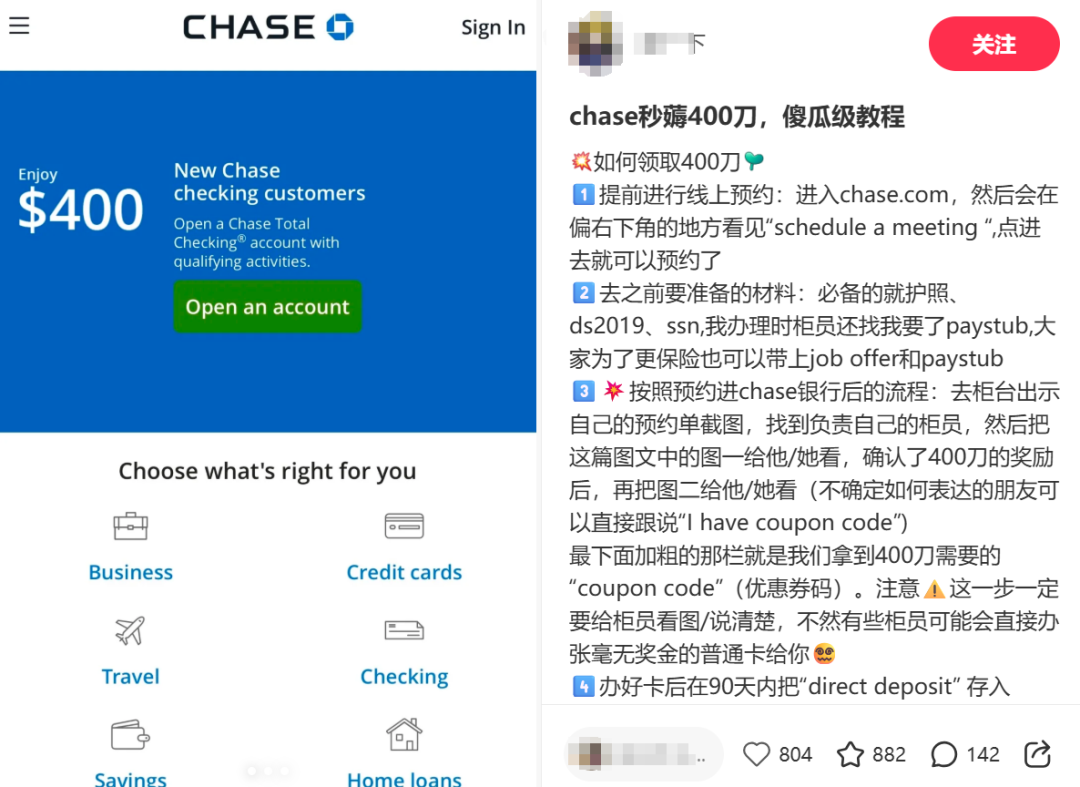 Chase(摩根大通):网点覆盖广,ATM 多且免手续费,部分网点有中文客服(第一天去听英文版专业术语会很迷茫),对留学生友好,开卡有400刀coupon code。