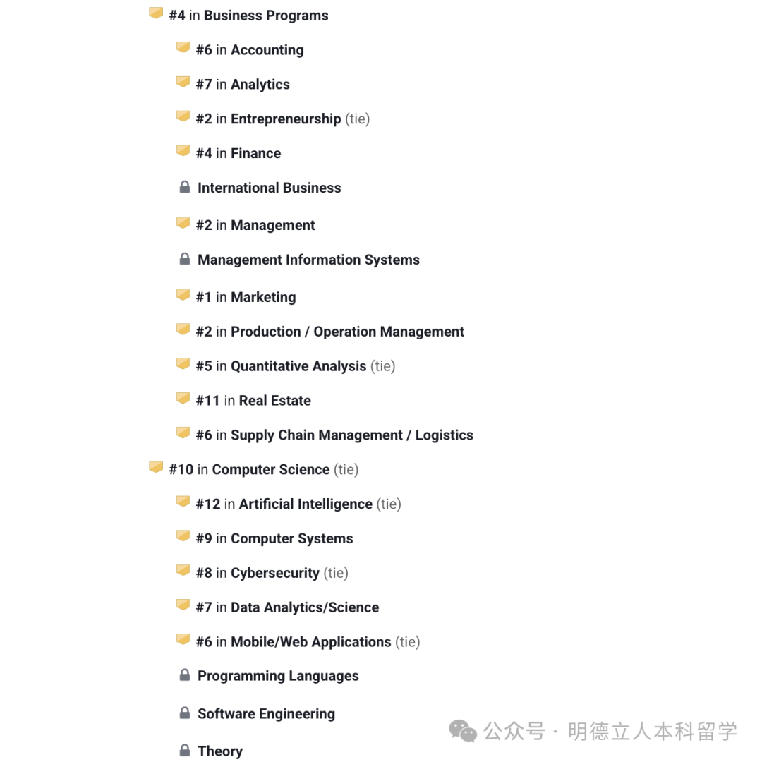 CS领域,UMich实力和加州理工、UT-Austin并列全美第10名,特别在移动/网络应用、数据分/科学、网络安全、计算机系统细分专业表现出色,均位列全美前10。