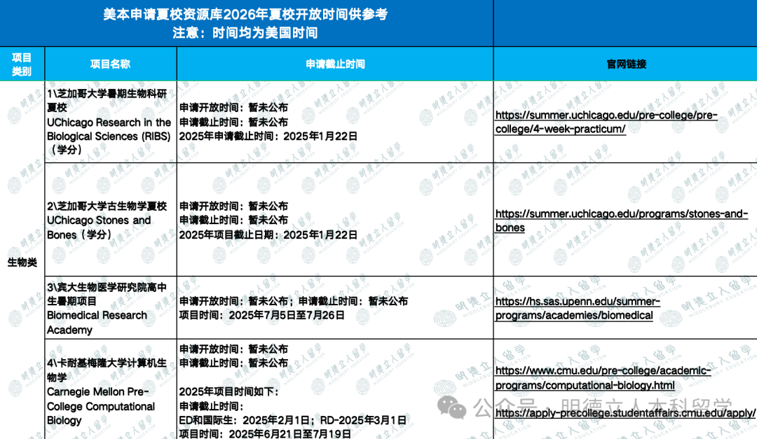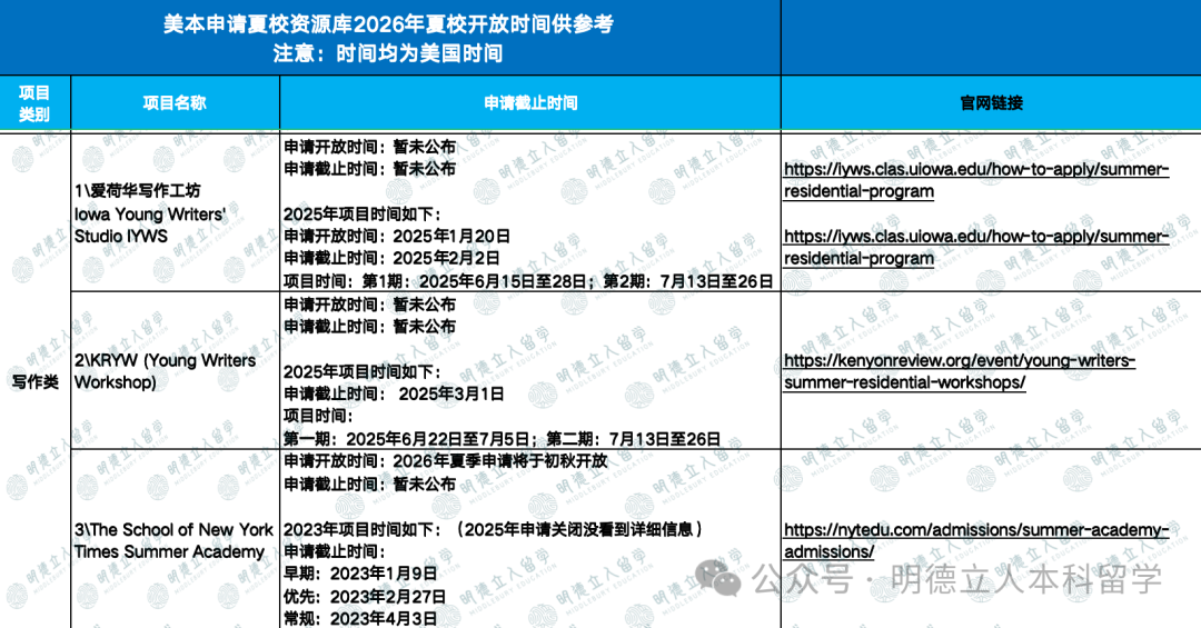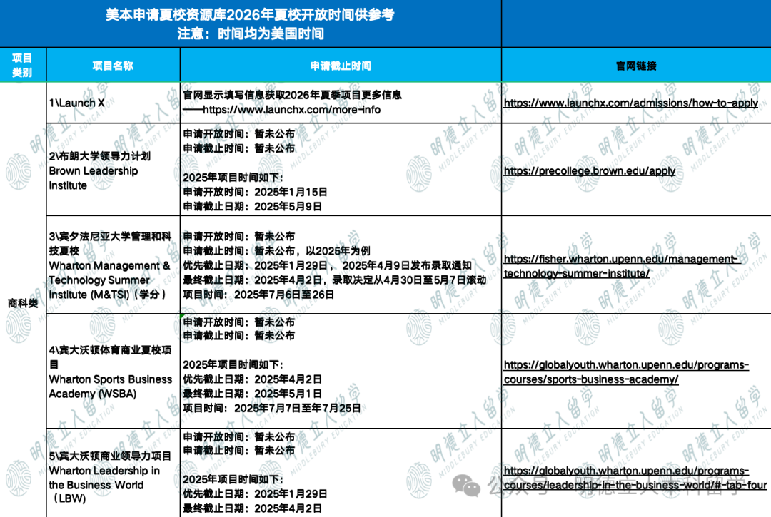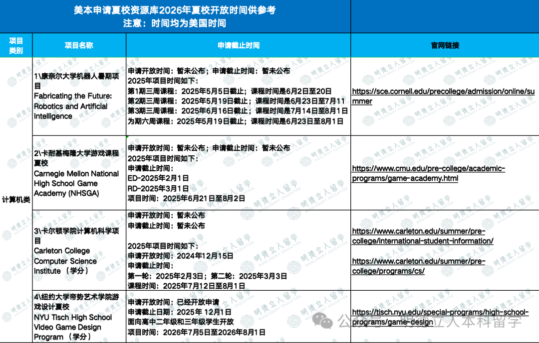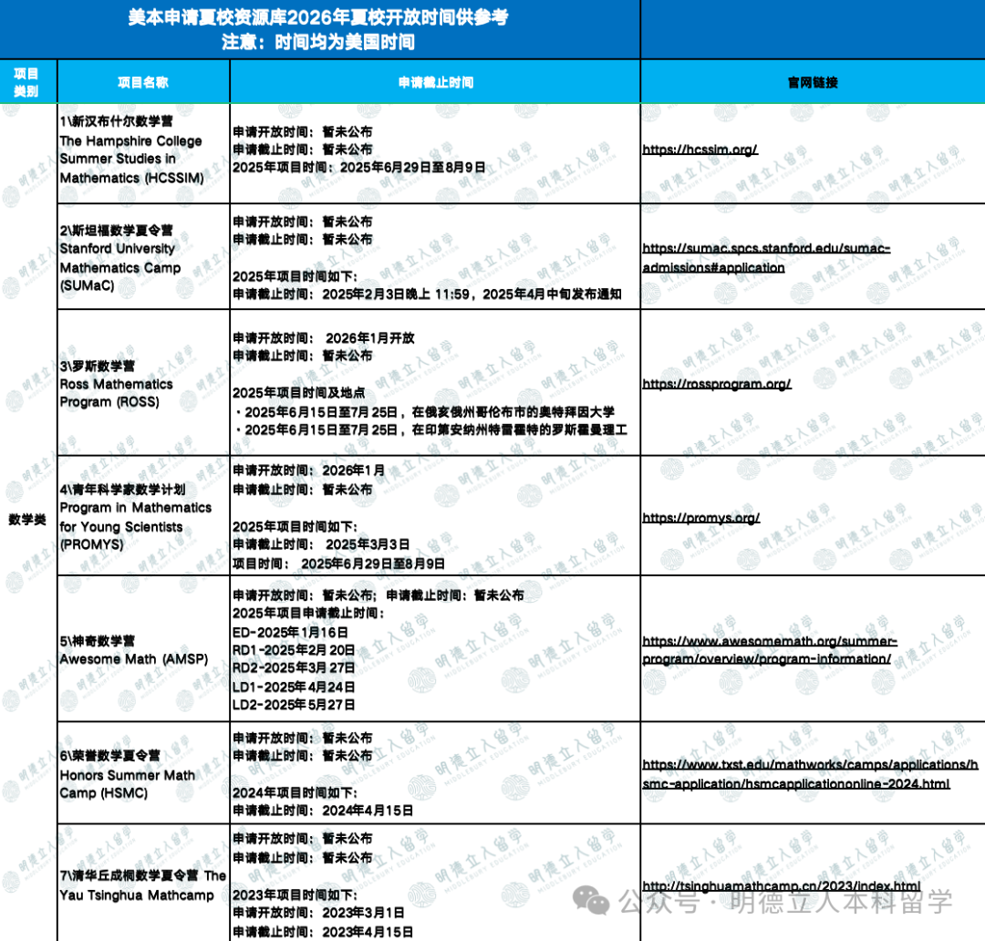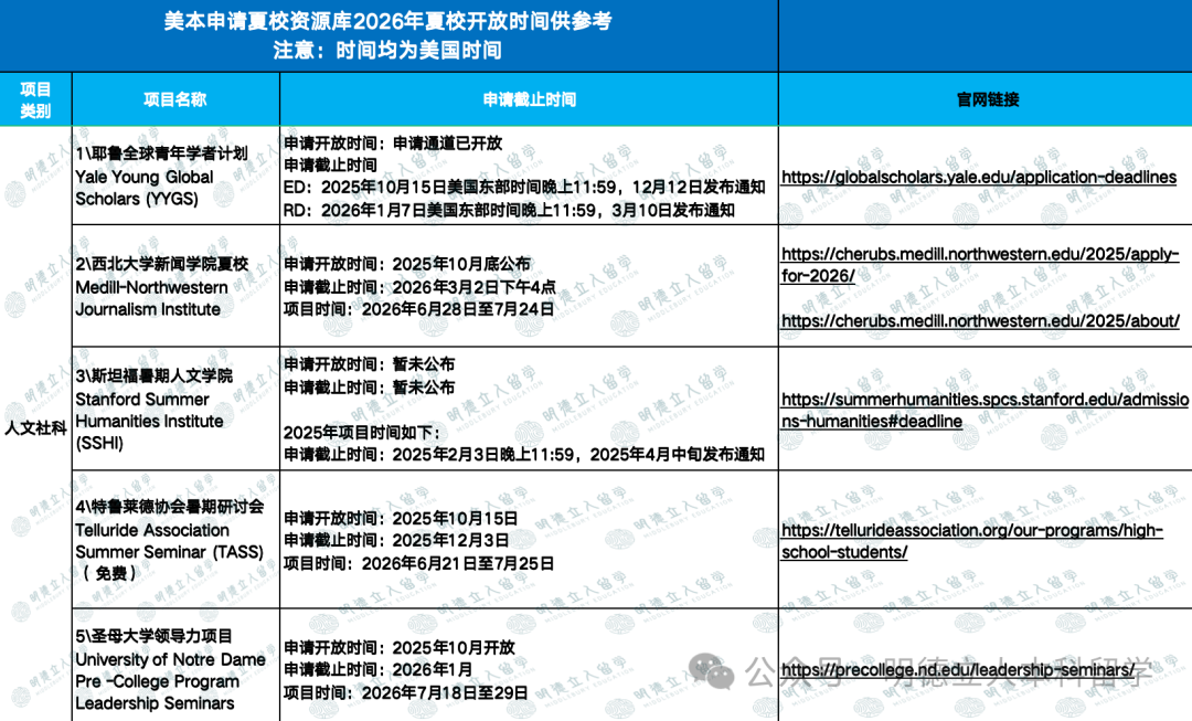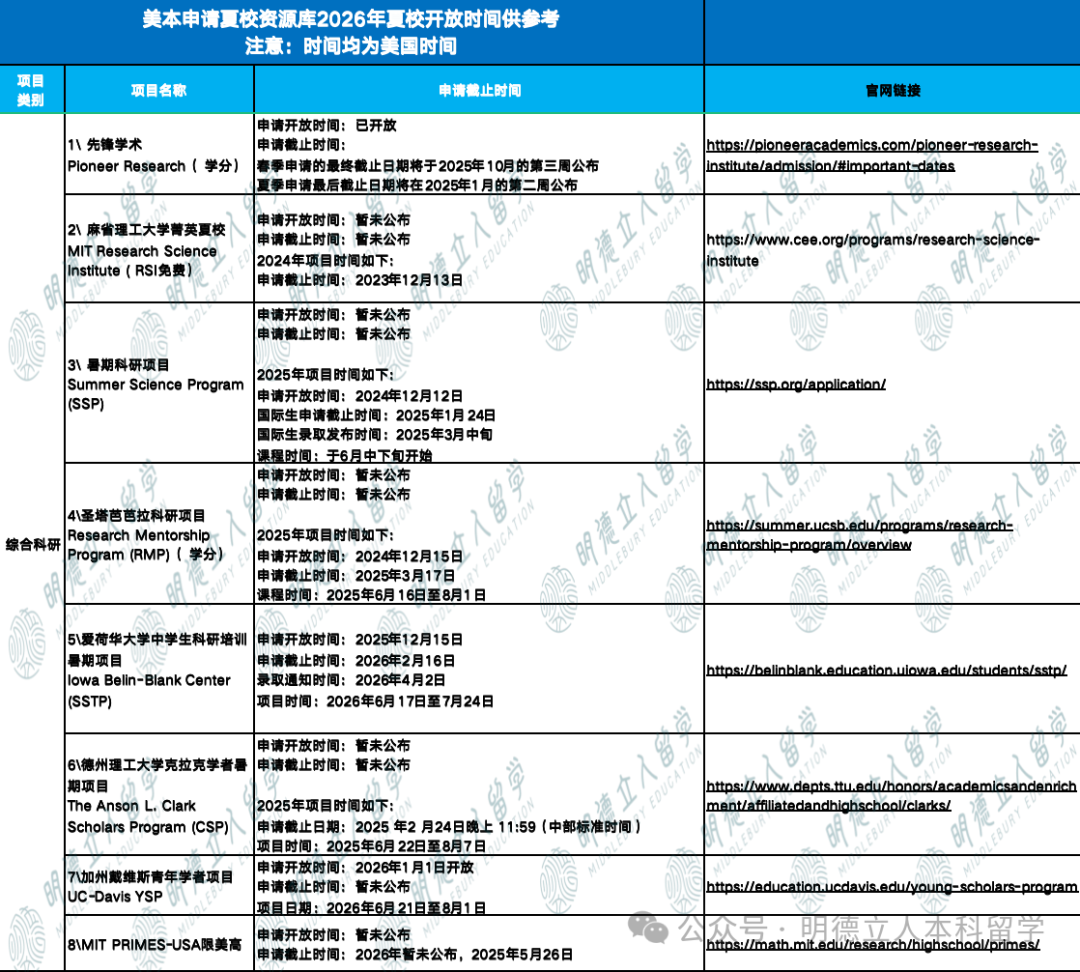 *注:部分夏校未公布2026年开放时间,2025年时间仅供参考。