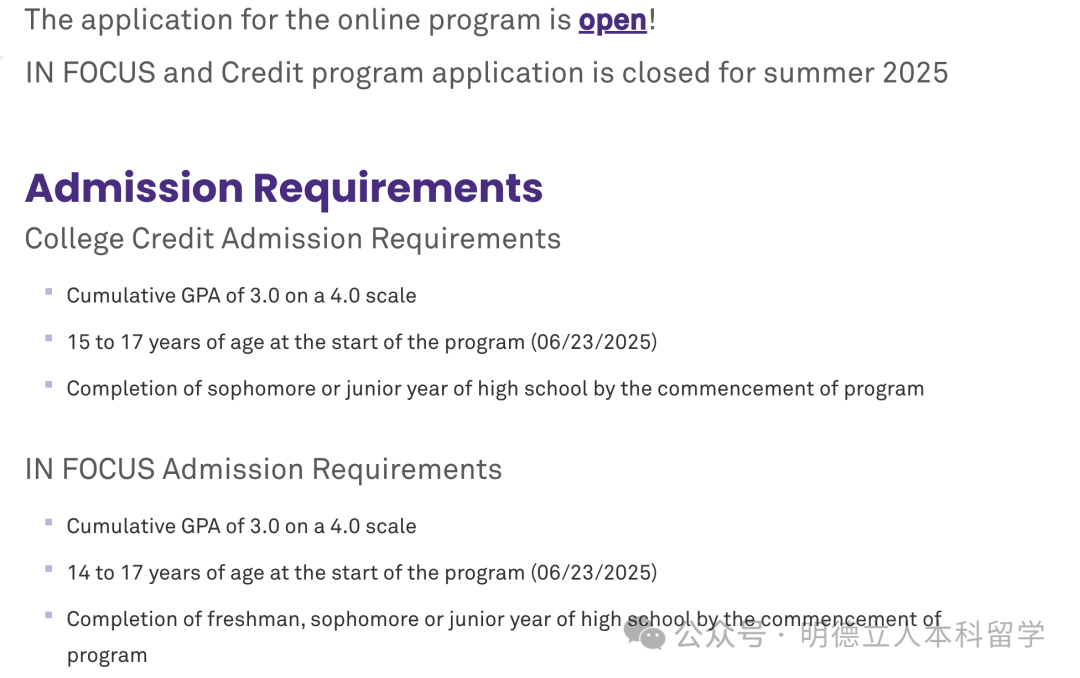 2025年夏季In FOCUS 研讨会项目和学分课程项目申请在4月3日已截止,在线课程申请现已开放,具体截止日期未透露。