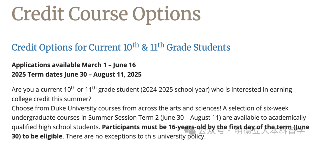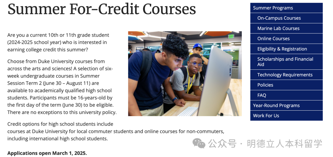 杜克的夏校项目可获取学分,但明确要求必须在2025年6月30日前年满16岁才有资格申请。