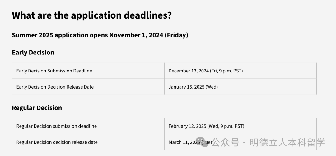 申请分为早申和常规轮,ED截止时间为2024年年12月13?,2025年1月15日发布通知;RD截止时间是在2025年2月12日,同年3月11日发布通知。