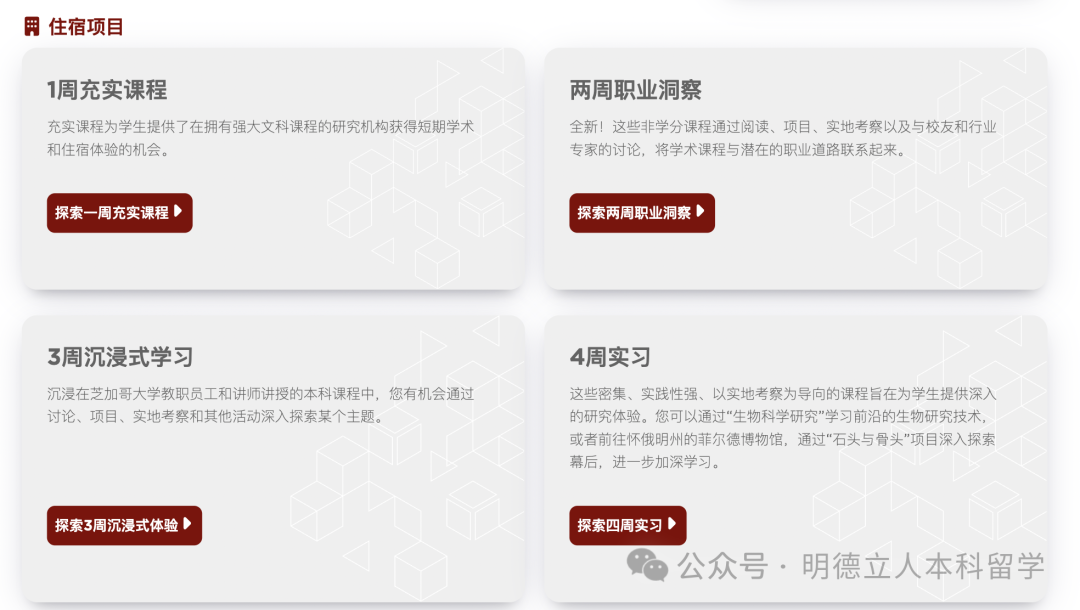 住宿又划分为4种:1周充实课、2周职业洞察、3周沉浸式学习、4周实习课。