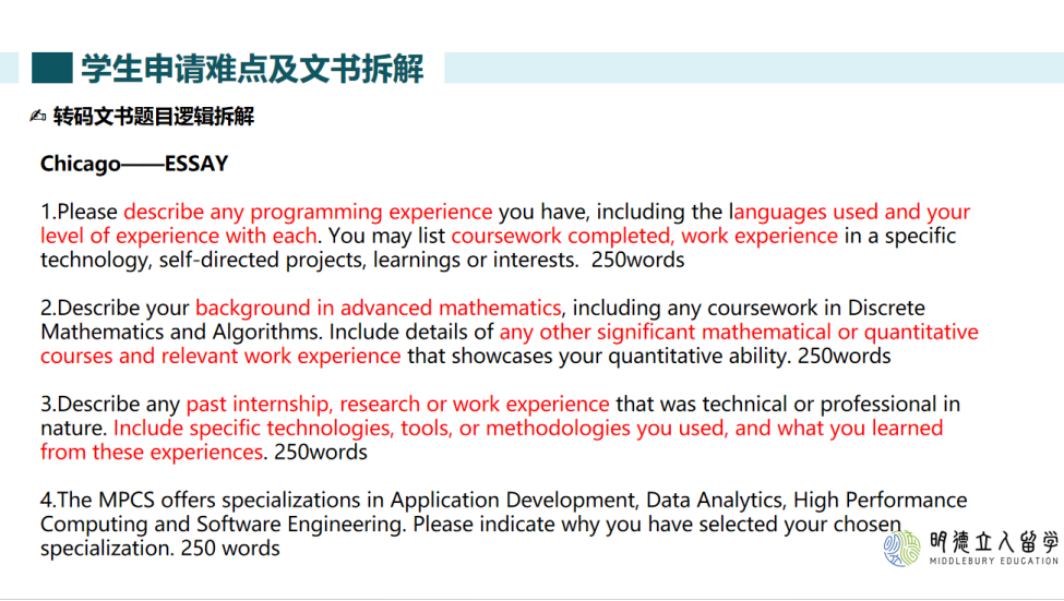 比如说芝加哥大学的Essay,这四个问题均是申计算机的典型问题!每个问题都非常细致,而且要求250字以内,一句“拖后腿”的话都不能说。