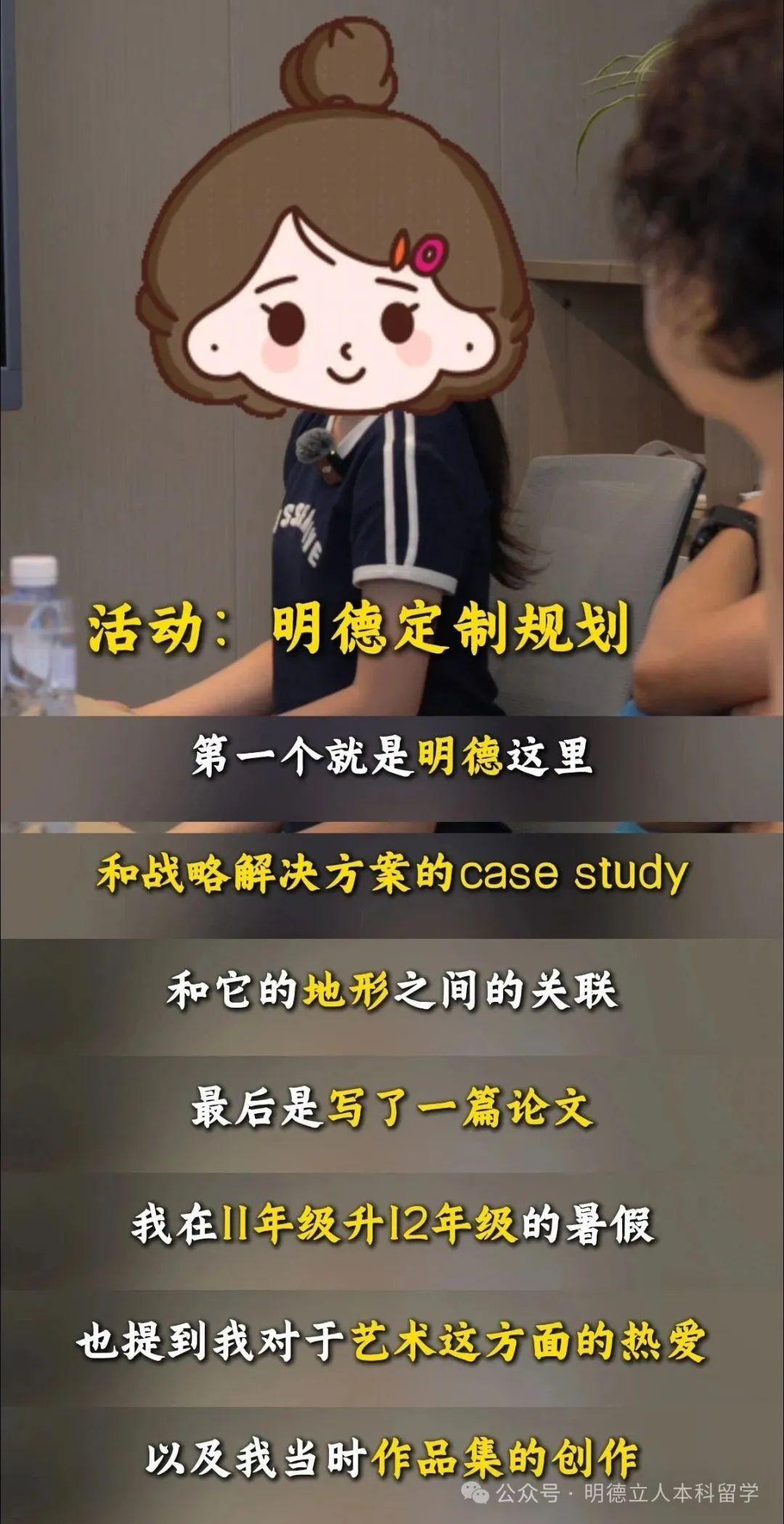 在活动规划+梳理上,帮助我发散思维、挖掘特色,量身打造高适配的活动;并且没有舍弃我的艺术作品集,而是充分利用已有资源,转化成了我的申请优势;
