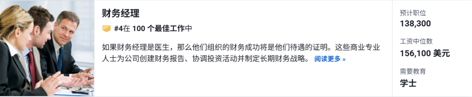在TOP100职业中,商科领域有11个职业上榜,其中“财务经理”位居第四,工资中位数达到了156,100 美元;