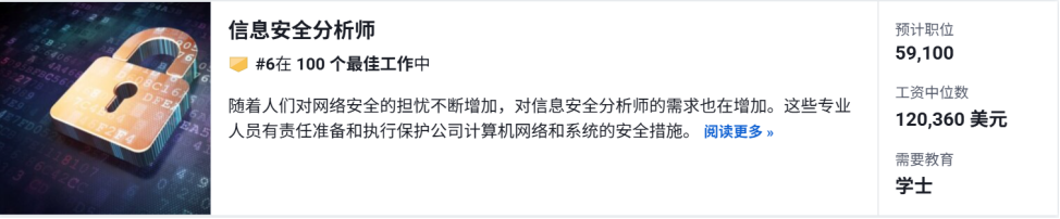 美国劳工统计局预计,2023年至 2033年间,信息安全分析师的就业人数将增长32.7%,估计将有 59,100 个工作岗位空缺。