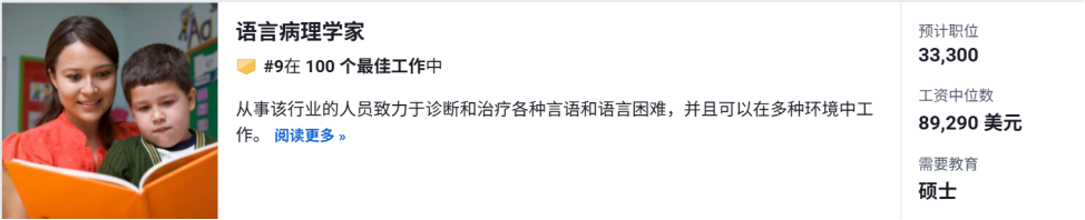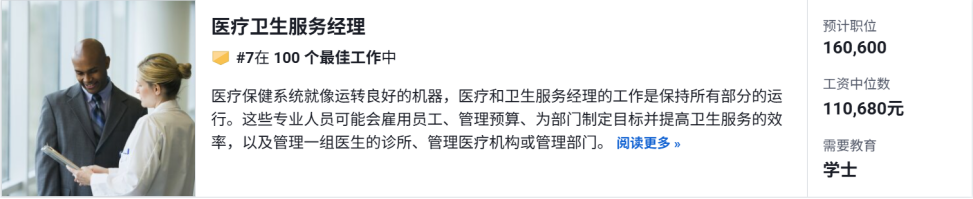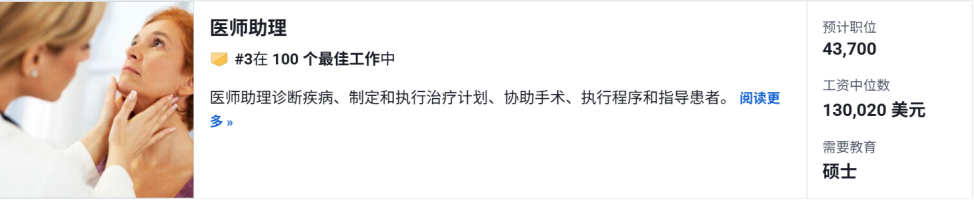 在综合排名中,随着美国对医疗保健职位需求的增加,排名前100个职业中有33个属于医疗保健行业。