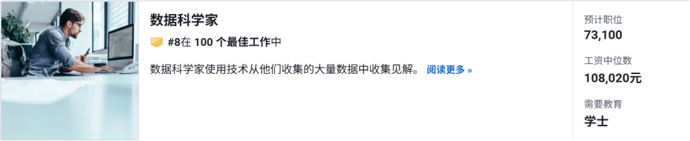 美国劳工统计局预计,2023年至 2023 年间数据科学家的就业将增长36%,估计将开放 73,100 个工作岗位。