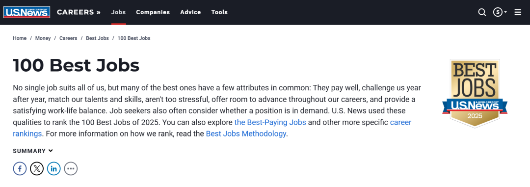 好在US.News最近发布了《2025全美最佳职业TOP100》,这无疑为我们选校提供了一份宝贵的指南:把就业前景和收入潜力作为选择专业的参考标准之一!