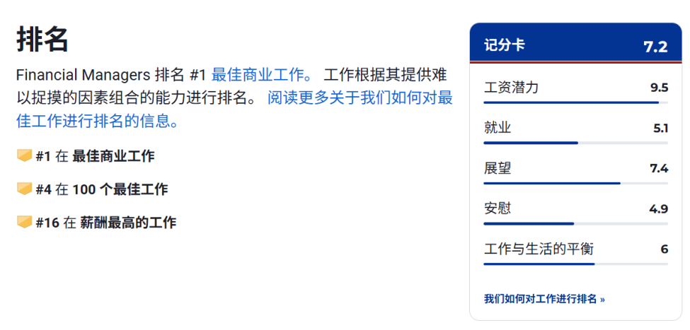 财务经理在“工资展望”这一项中拿到了9.5的好分数(满分10分),这说明未来财务经理的“钱途”还会持续上涨!