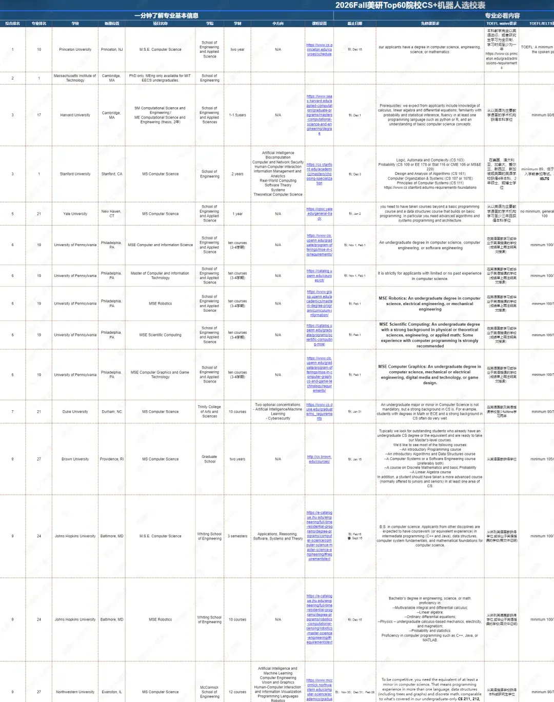 包含学校、排名、所在学院、学科小方向、截止日期、绩点语言要求、明德独家项目特色分析(根据历年同学申请经验所得)等内容,可以说美研择??凑飧霰砭妥愎焕?!
