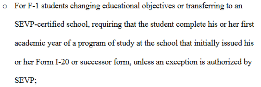 研究生学位水平以下(本科)的F-1学生必须在原学校读满一年才能转学或转专业,除非SEVP特批。