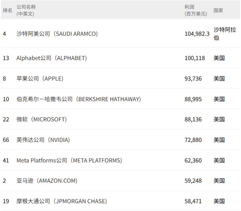 另外三家美国科技企业——微软、Meta Platforms公司和亚马逊分别位居利润榜的第五、第七和第八位。