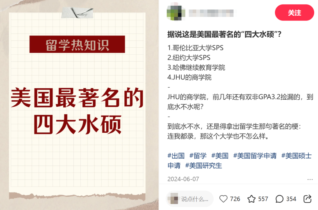 还有这份《留学圈“水硕”名单》,在小红书上被疯传,因为转载次数过多,这份名单的画质已经变得十分模糊。
