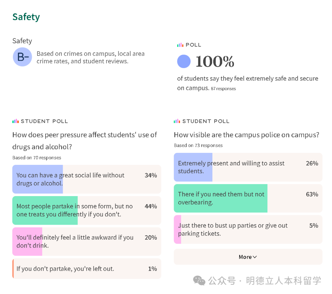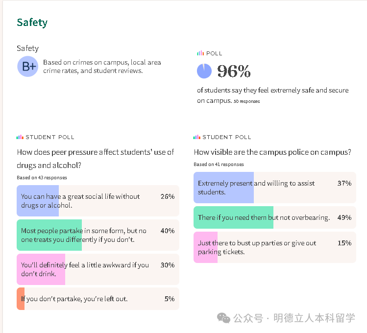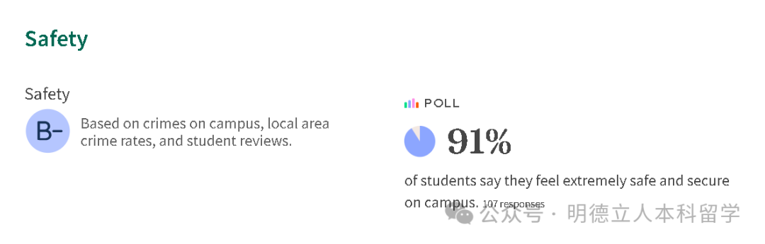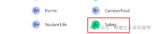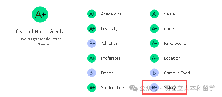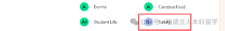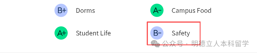 但在Niche安全评级中位B-,也是考虑到评价维度比较多样,不单单只是学生们的主观评价,也有校园犯罪率、周边社区安全、学生心理健康支持等多维度。