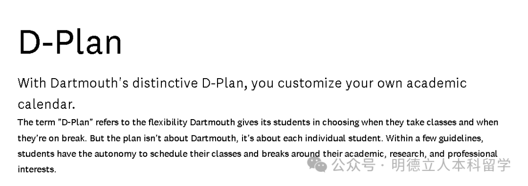 D-Plan 将一学年划分为四个等长的学期,每个学期持续10周,学生在一个学年内修满所需学分后,只要完成三个学期的课程,就可以自由选择在春、夏、秋或冬任何一个学期进行实习、出国学习或休假。
