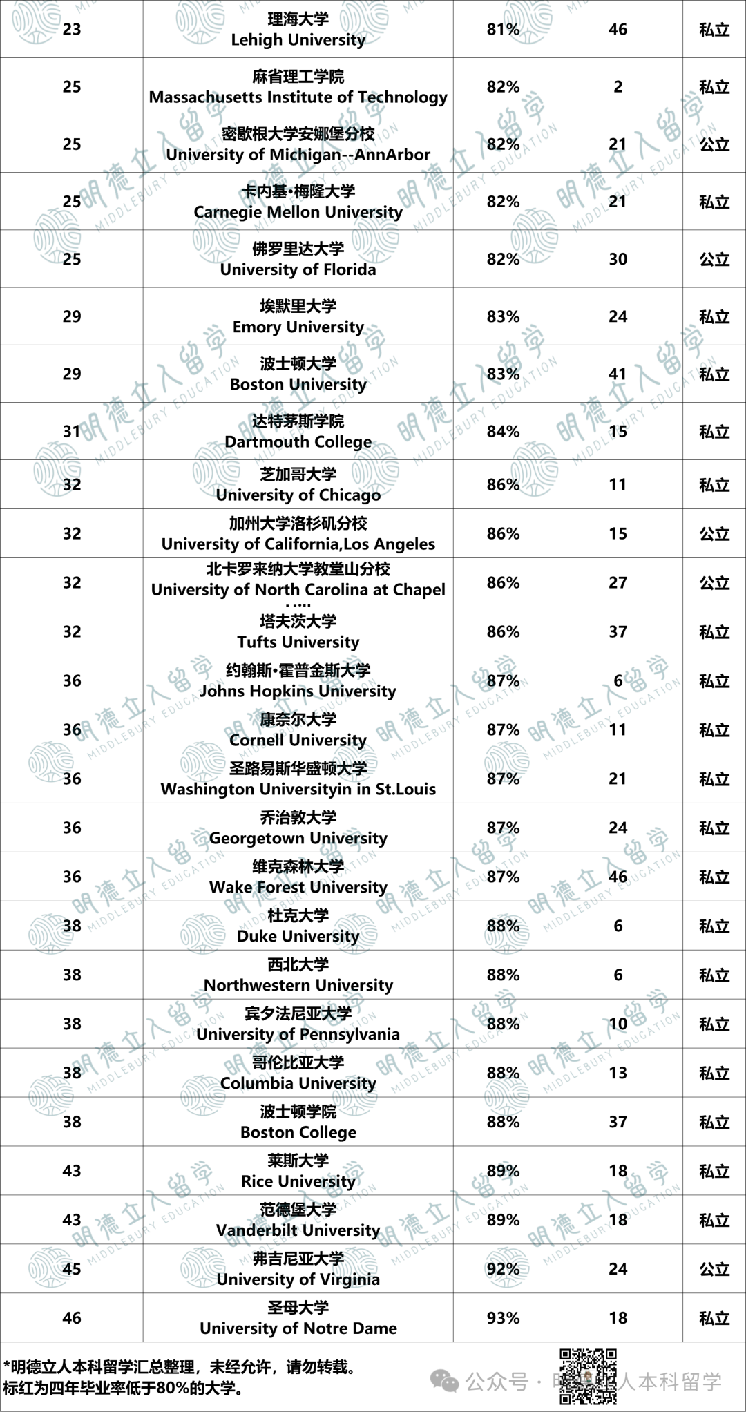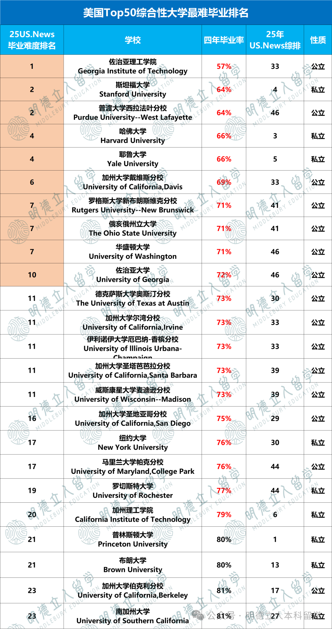 --有20所T50大学四年毕业率都低于80%,其中最难毕业的佐治亚理工学院只有57%;