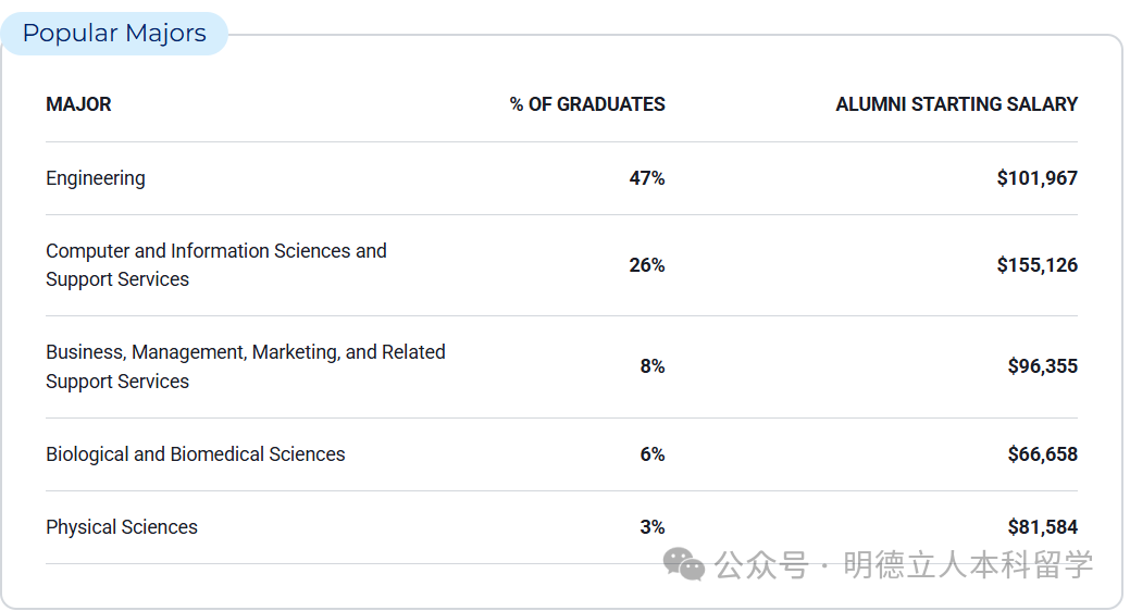 毕业生主要的热门专业为工程、计算机和信息科学及支持服务、商业、管理、营销和相关支持服务、生物和生物医学科学、物理科学领域。