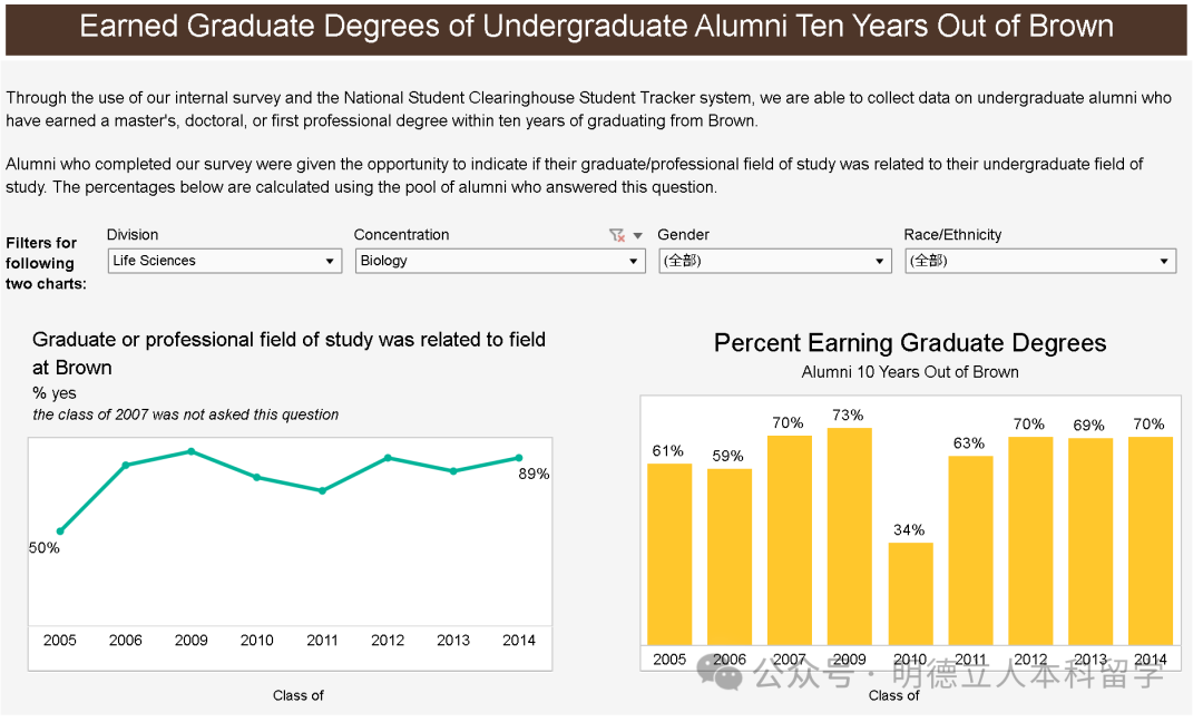 根据布朗大学对研究生校友的数据统计,该校生物学专业的本科毕业生中,在毕业10年后有高达70%的人获得了研究生学位。