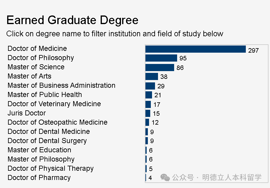 医学博士人数最多,达到297人,说明医学是生物学本科毕业生最热门的发展方向之一。