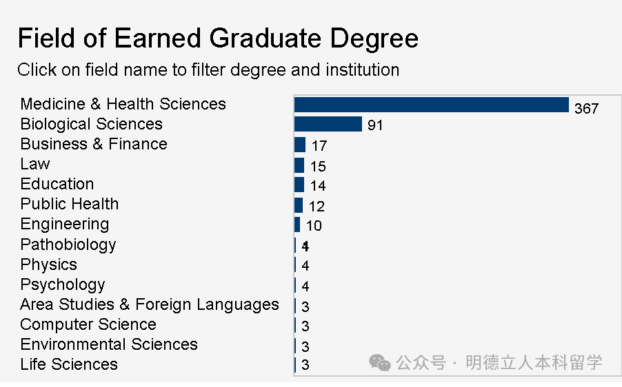 医学与健康科学领域人数最多,达367人,进一步印证医学是该专业毕业生主流发展方向。