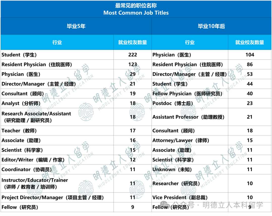 “最常见职位名称”数据揭示了生物专业毕业生从毕业5年到10年的职业发展轨迹。