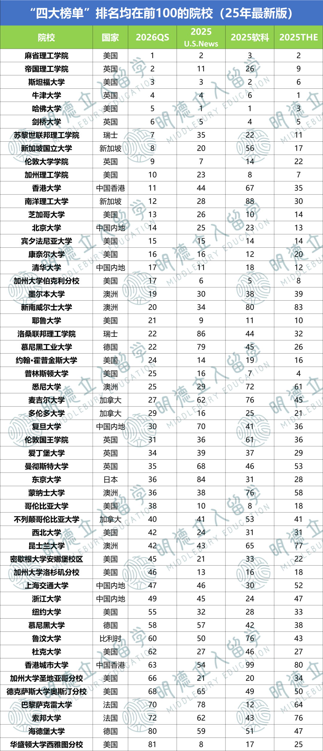 小德综合了最新版四大排名,以QS为基准,以下53所大学均在前100!