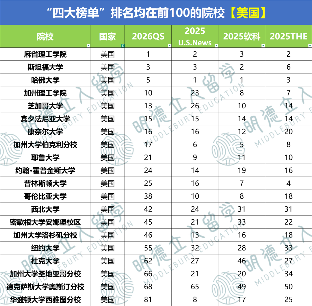 在榜单中,美国依旧是名校大本营,53所院校中有20所上榜!数量第一,分别是: