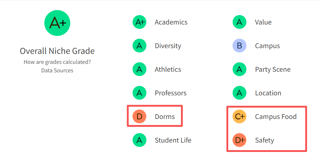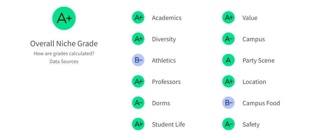 除了安全系数之外,Niche还给出了其他方面的系数,例如学术水平、多样性、宿舍、学生生活、地理位置、餐饮 等等,择校时也可以参考院校的其他方面。