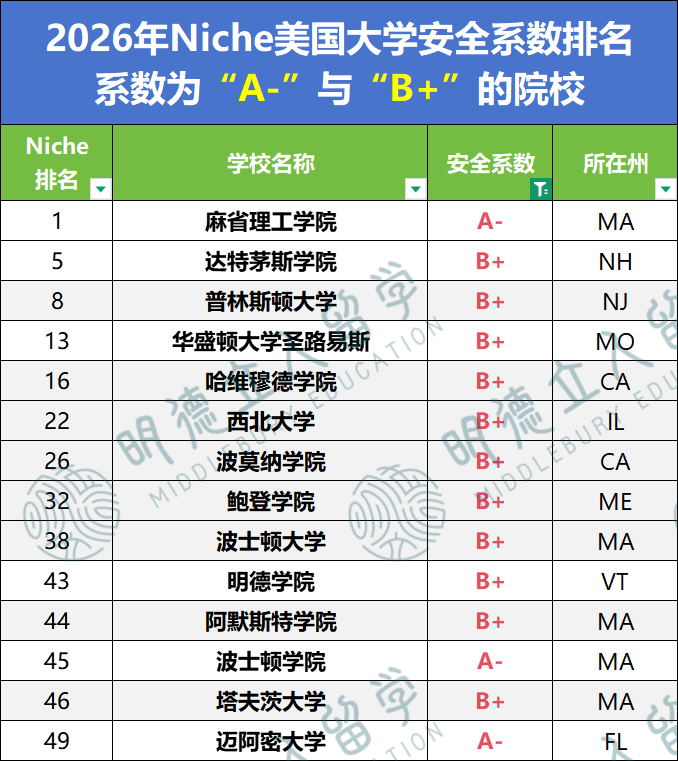 例如榜单中的明德学院、阿默斯特学院、鲍登学院等,都获得了B+的评级。