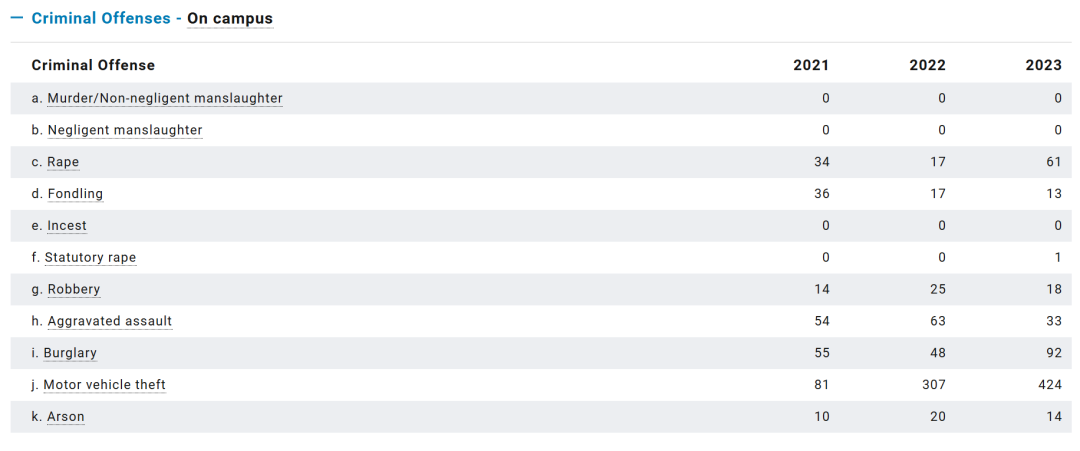 根据美国的《Clery 法案》,学校必须公开所有包括盗窃、纵火、抢劫、谋杀等案件在内的犯罪数据,而这些数据都可以在美国教育局的官方网站上查询到。