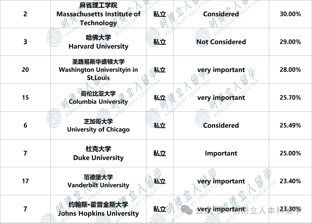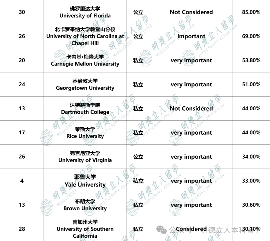 另外USC和MIT表示是“考虑”,但提交比例和十分看重班级排名的莱斯、UVa、耶鲁、布朗水平差不多,在30%出头。