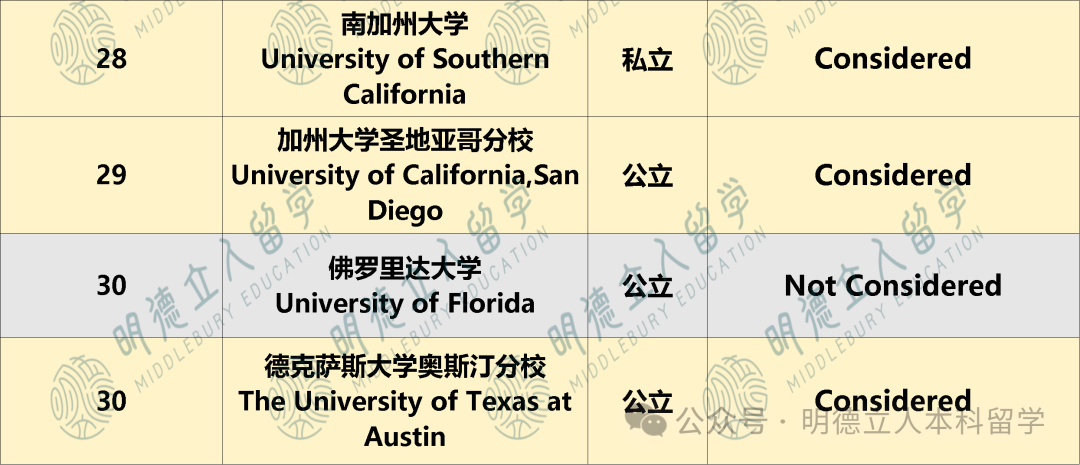 公立校共有6所,UCB、UCLA、UMich和UF表示“不考虑”,UCSD、UT-Austin则是表示“考虑”。