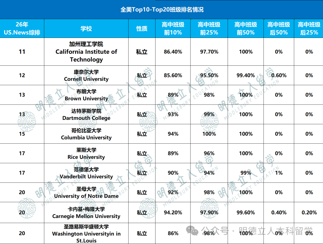 相应地,班级前11%-25%的学生比例增加,比如除了范德堡和CMU为4%,其余均超过5%,特别是加州理工、康奈尔超10%。