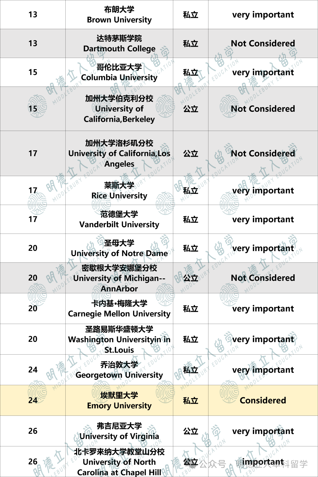 斯坦福和康奈尔的重要程度分别是“非常重要”“重要”,提交比例都约在18%,埃默里虽然是“考虑”,但是提交比例是Top最低的,仅有4.5%。