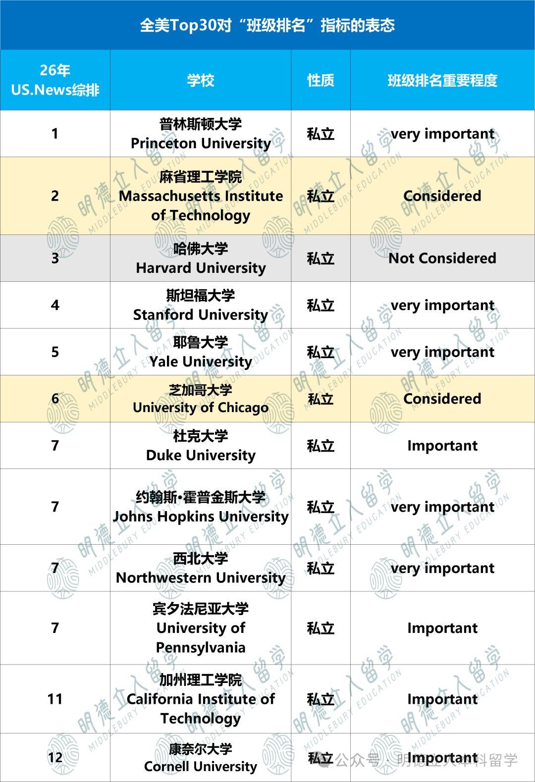 从阵营来看,共有19所学校明确将班级排名视为核心评估要求,视为“非常重要”和“重要”指标,占Top30总数的61%。