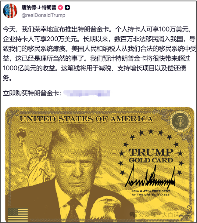 同时,特朗普嚷嚷很久的“金卡”政策也出炉,分为个人版和企业版:个人捐赠 100 万美元或由公司或类似实体代表个人支付 200 万美元的外国人提供快速移民签证,获得美国的永久居留权。