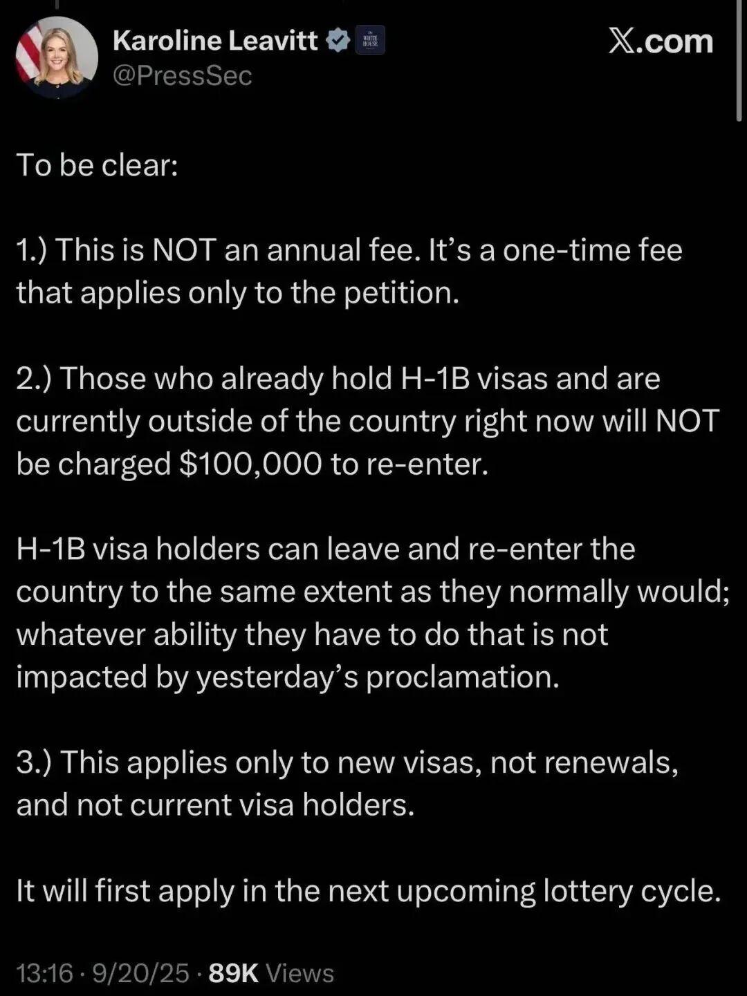 2. 持有H1B签证且人在美国境内暂不受影响,一旦离开美国,重新入境需交10万美金,时效为1年,1年后离境再入境还得重交,一直在美国境内,不需要重复交。