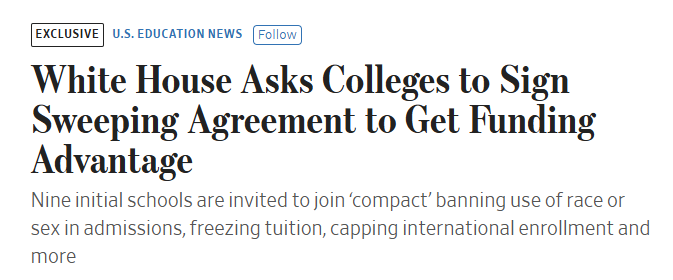 10月初,特朗普发布了一份《高等教育学术卓越契约》备忘录,包含10点内容,要求大学签署,以换取联邦资金的优先权。