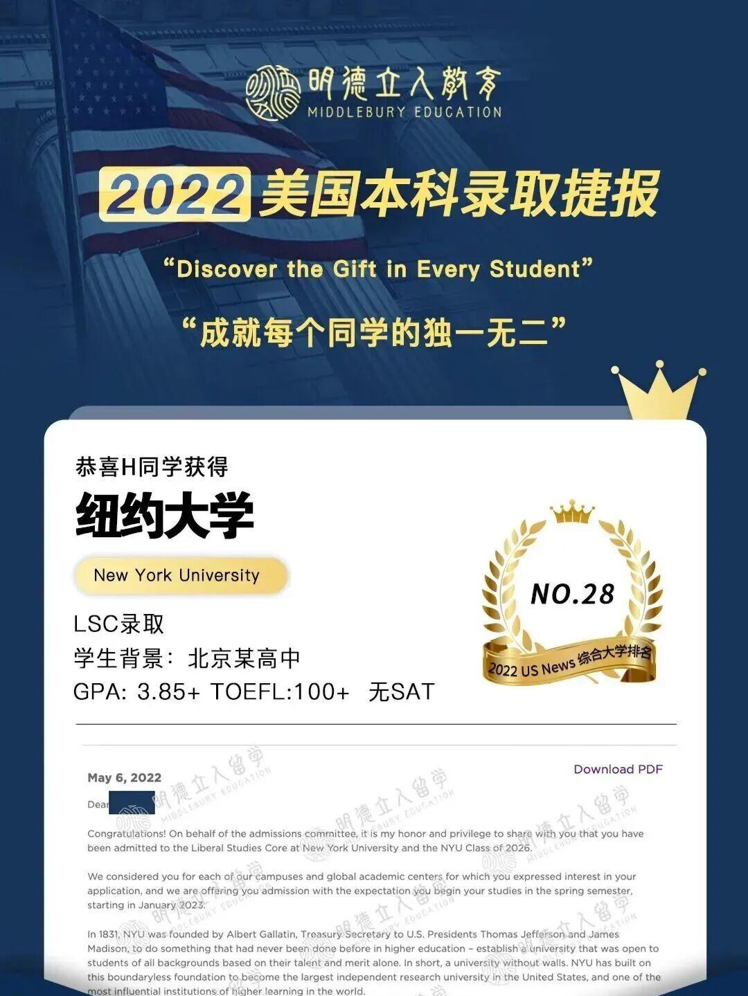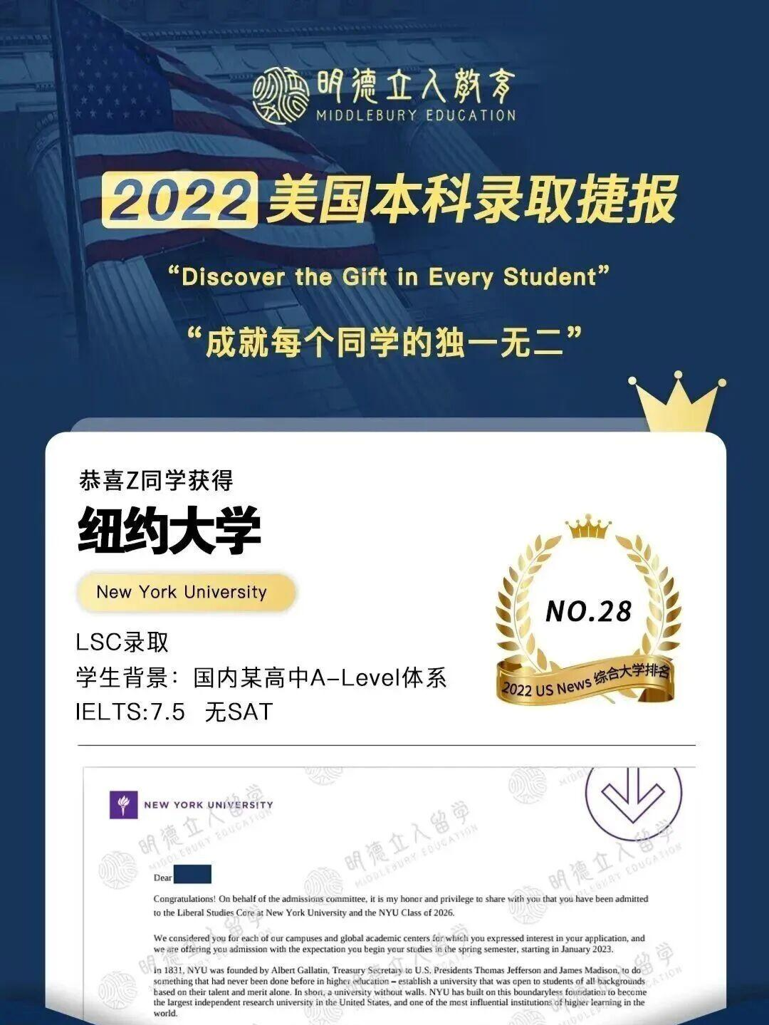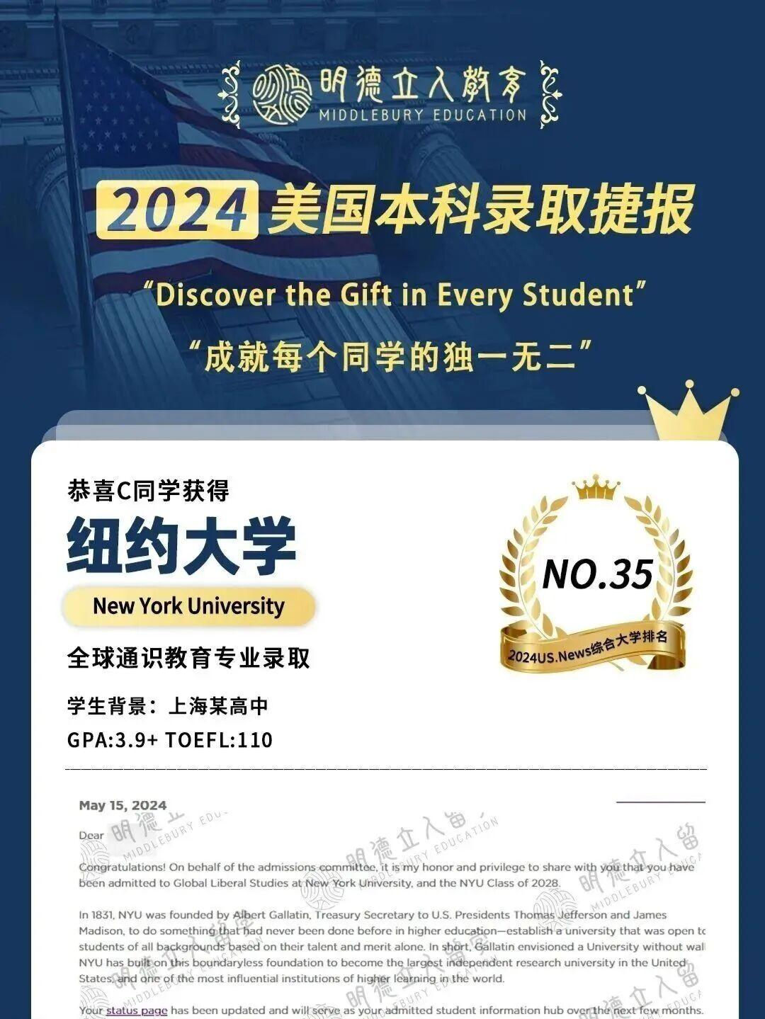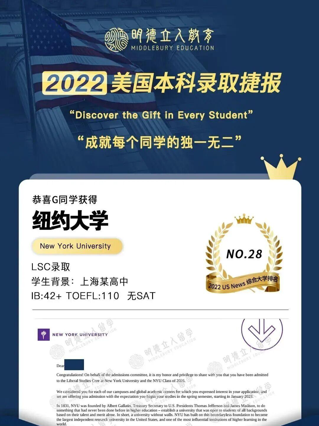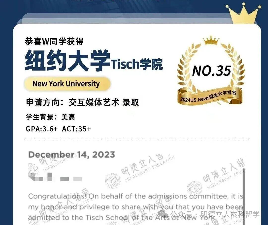 不过,明德深耕美本申请10年+,在助力圆梦上一直相当给力。近年来,明德学员斩获了21枚NYU录取,其中不乏难度指数TOP级的Stern商学院、Tisch艺术学院。