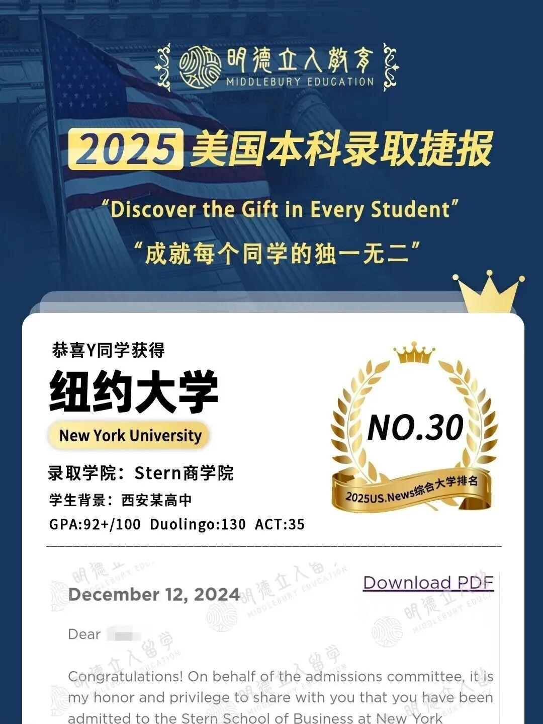 这些明德学员原始背景分布全球,来自北京、广州、上海、山东、南京、苏州、西安、美高、瑞典高中、加拿大课程等,其中25fall明德学员Y同学收获了U.S.News全美本科商科排名第5的Stern商学院录取。